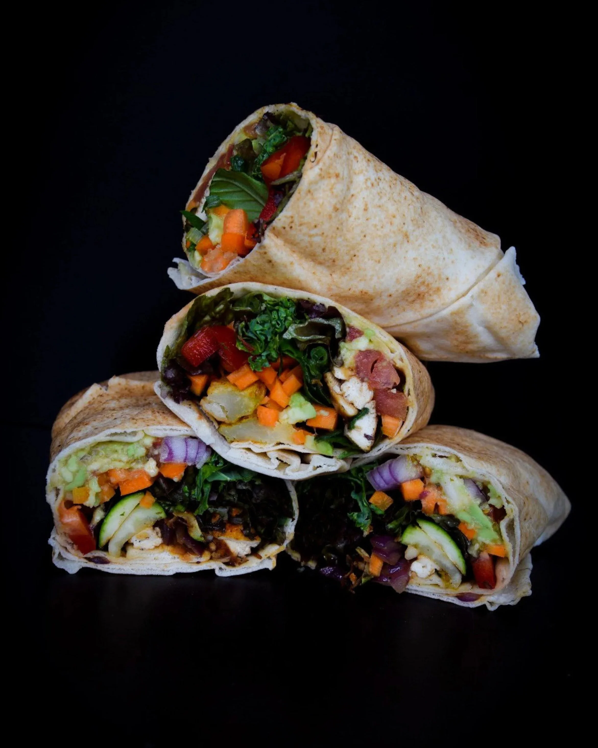 Avocado, frisches Gemüse, Salat, knuspriger Tofu & würzige Pilze, Guacamole, knusprig gebackene Kichererbsen, oder sogar Ofen-Kartoffelwürfel .